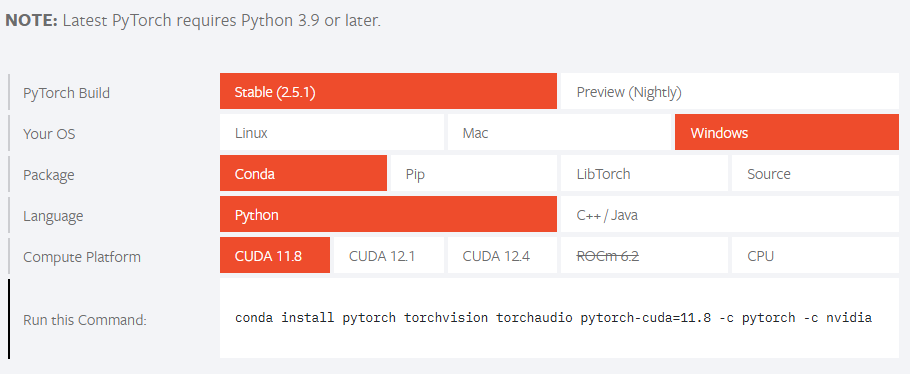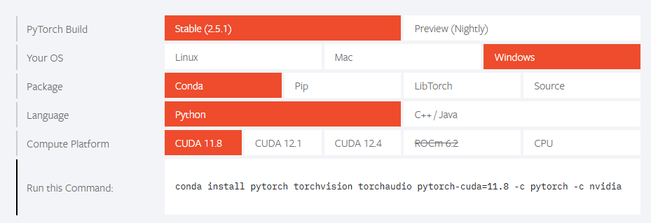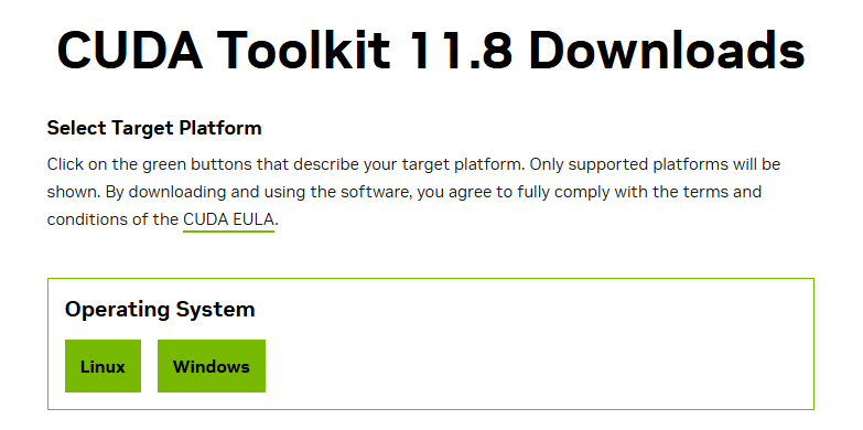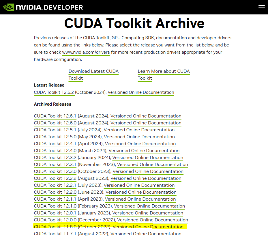 pytorch와 호환되는 버전을 확인해보면, CUDA 11.8과 12.1, 12.4가 사용 가능하다. 따라서 CUDA 11.8을 설치해야 함.
