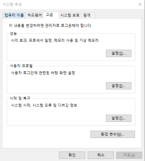 시작 검색창에 환경변수를 검색해서 '시스템 환경 변수 편집'에 들어간다.