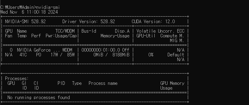 모든 설치를 마친 후에 nvidia-smi를 해도 이전과 동일하게 CUDA version이 12.0으로 나오지만 당황하지 말기.
